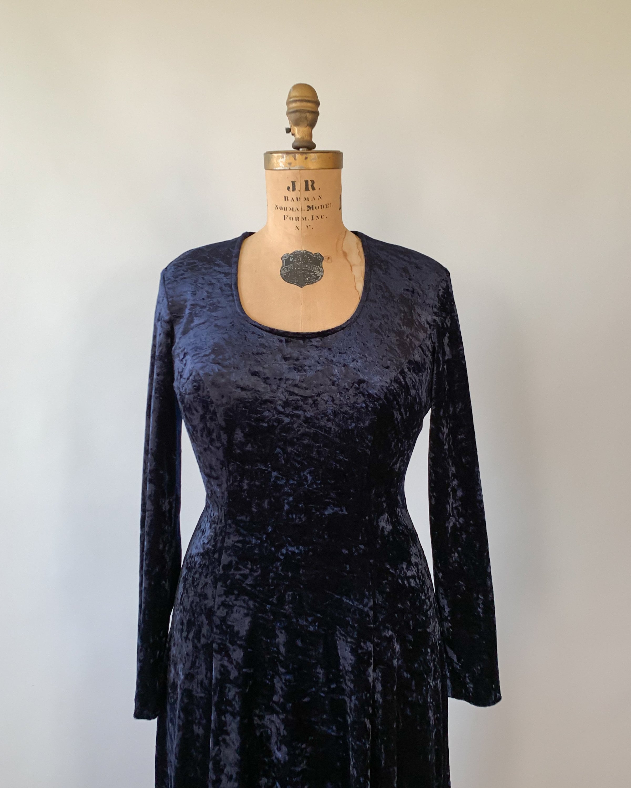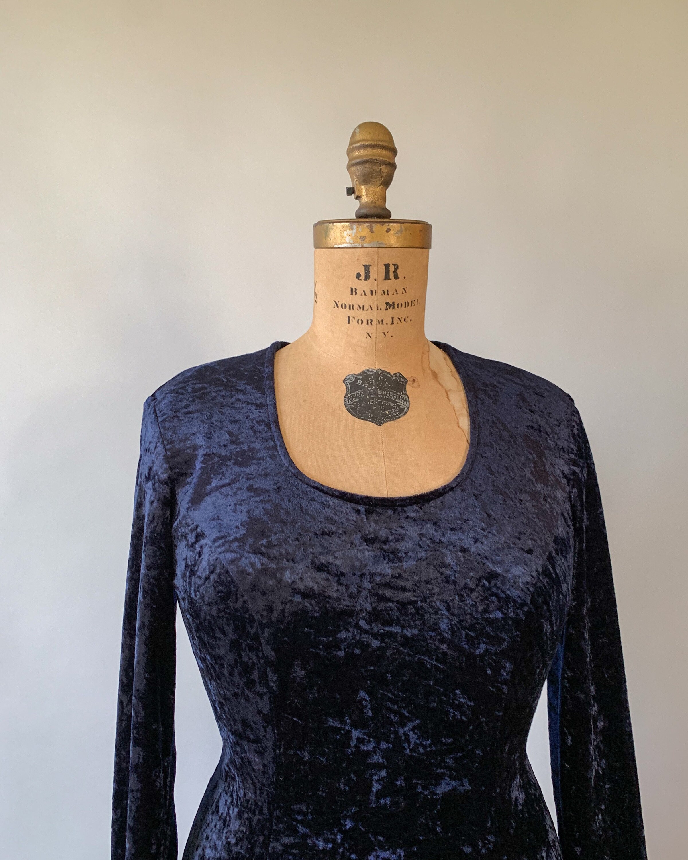 A 1990s navy velvet midi dress. Made from stretchy, crushed velvet, the dress has long sleeves, a flattering scoop neck, nipped in waist, and a long midi skirt. It features a sexy, statement cut out back.