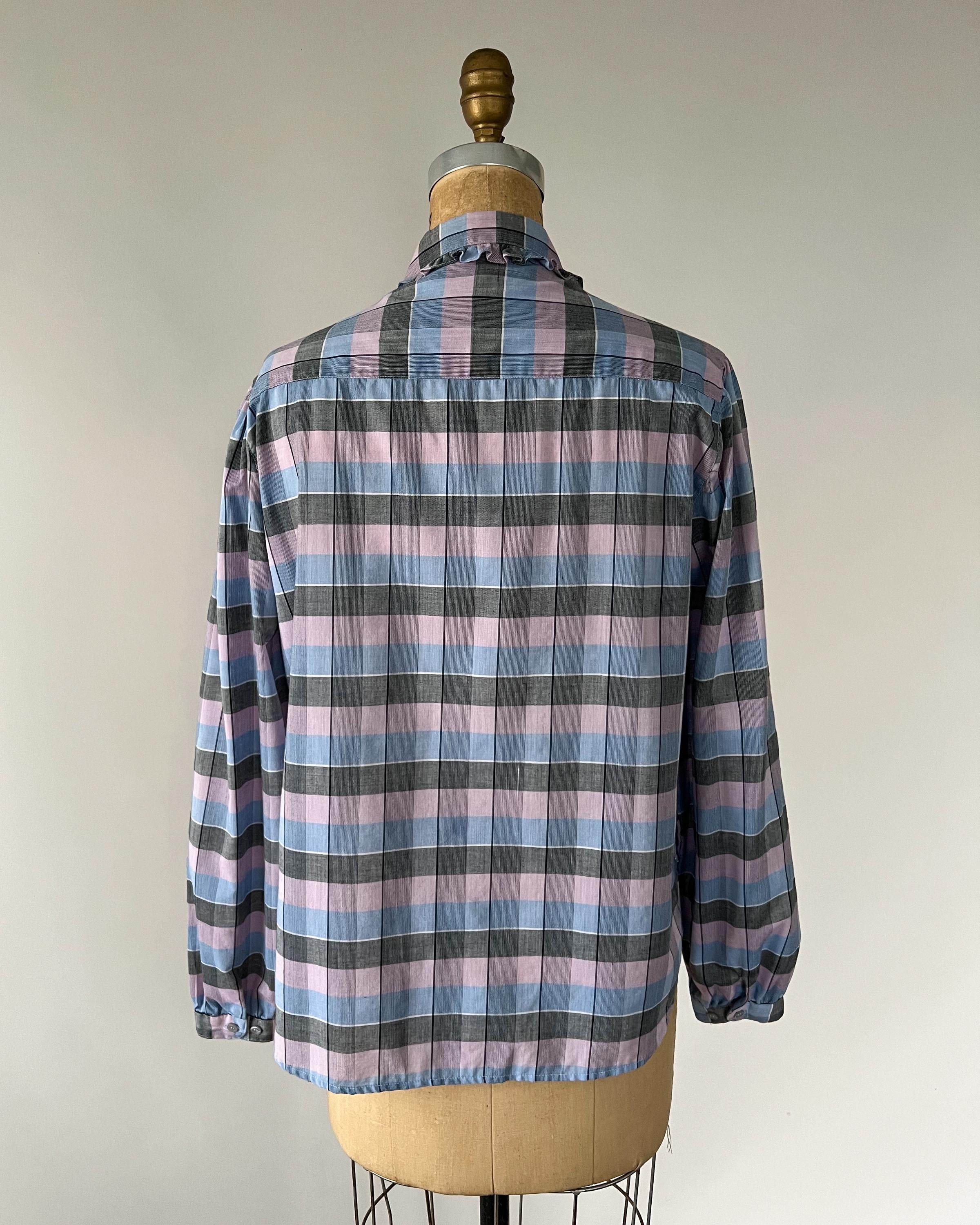 An adorable plaid shirt from the early 1980s! Made from a lovely lilac, periwinkle, & gray plaid, it has the cutest ruffled collar, front buttons, and long, puffy sleeves. Equally cute worn loose with jeans or tucked into a skirt!