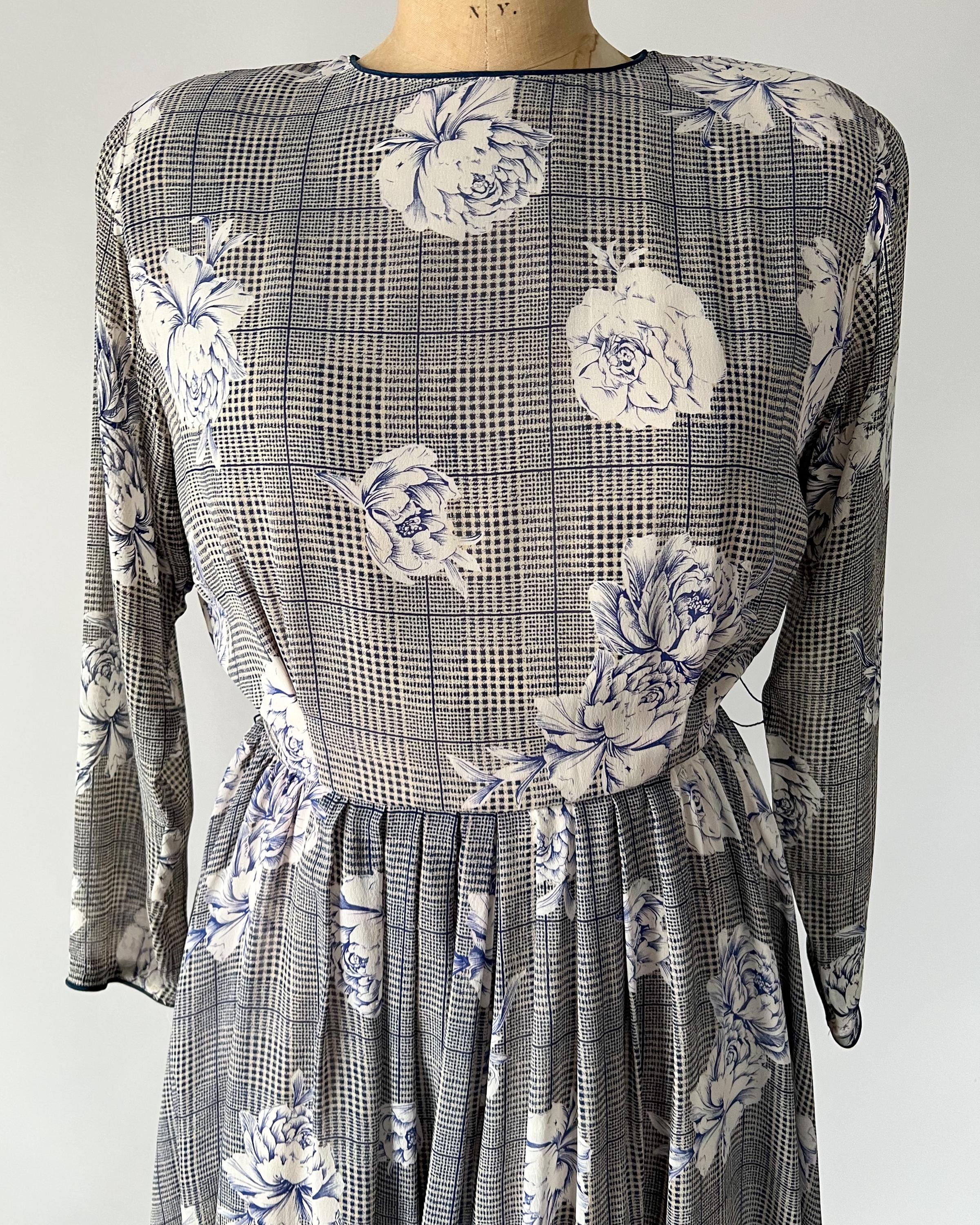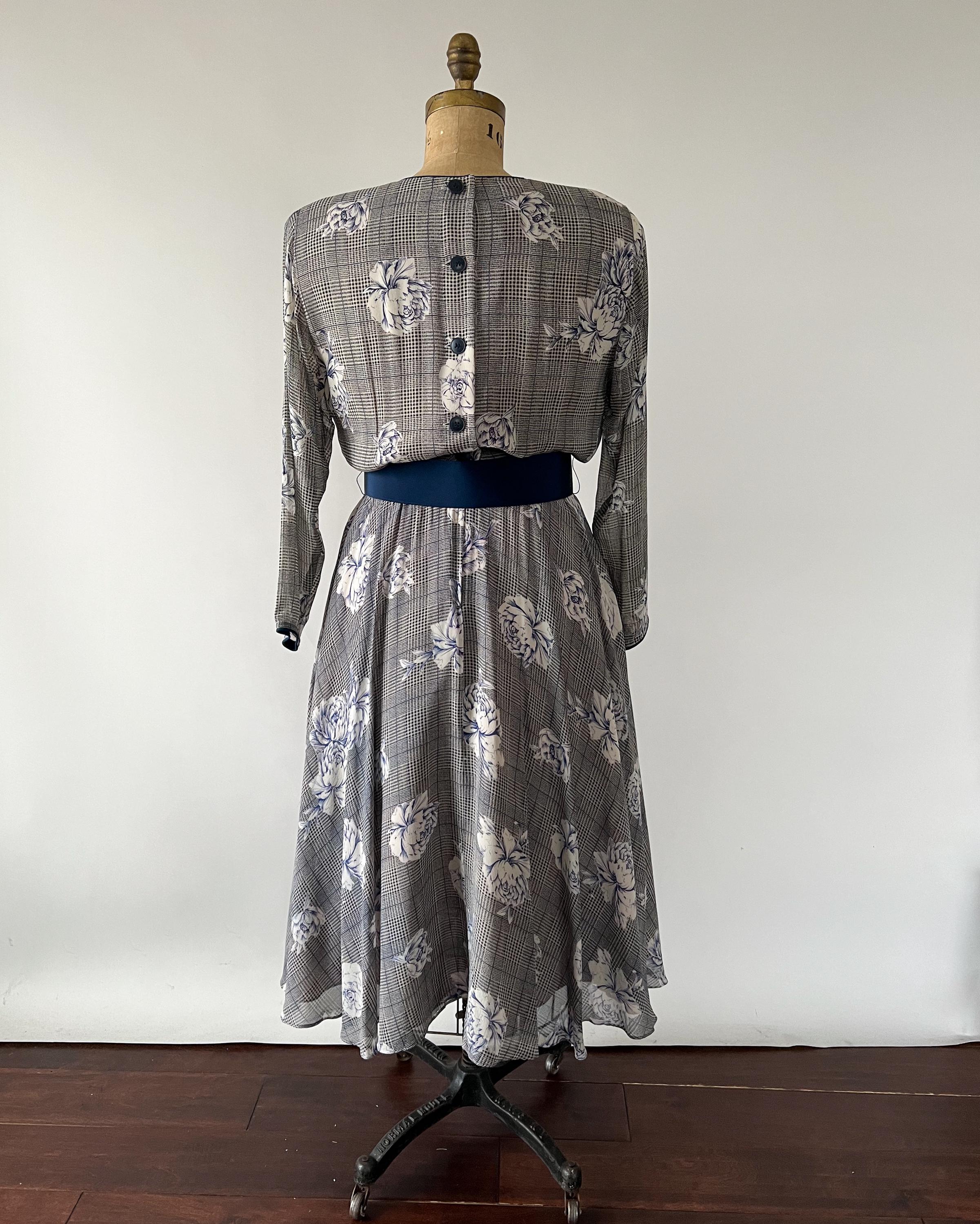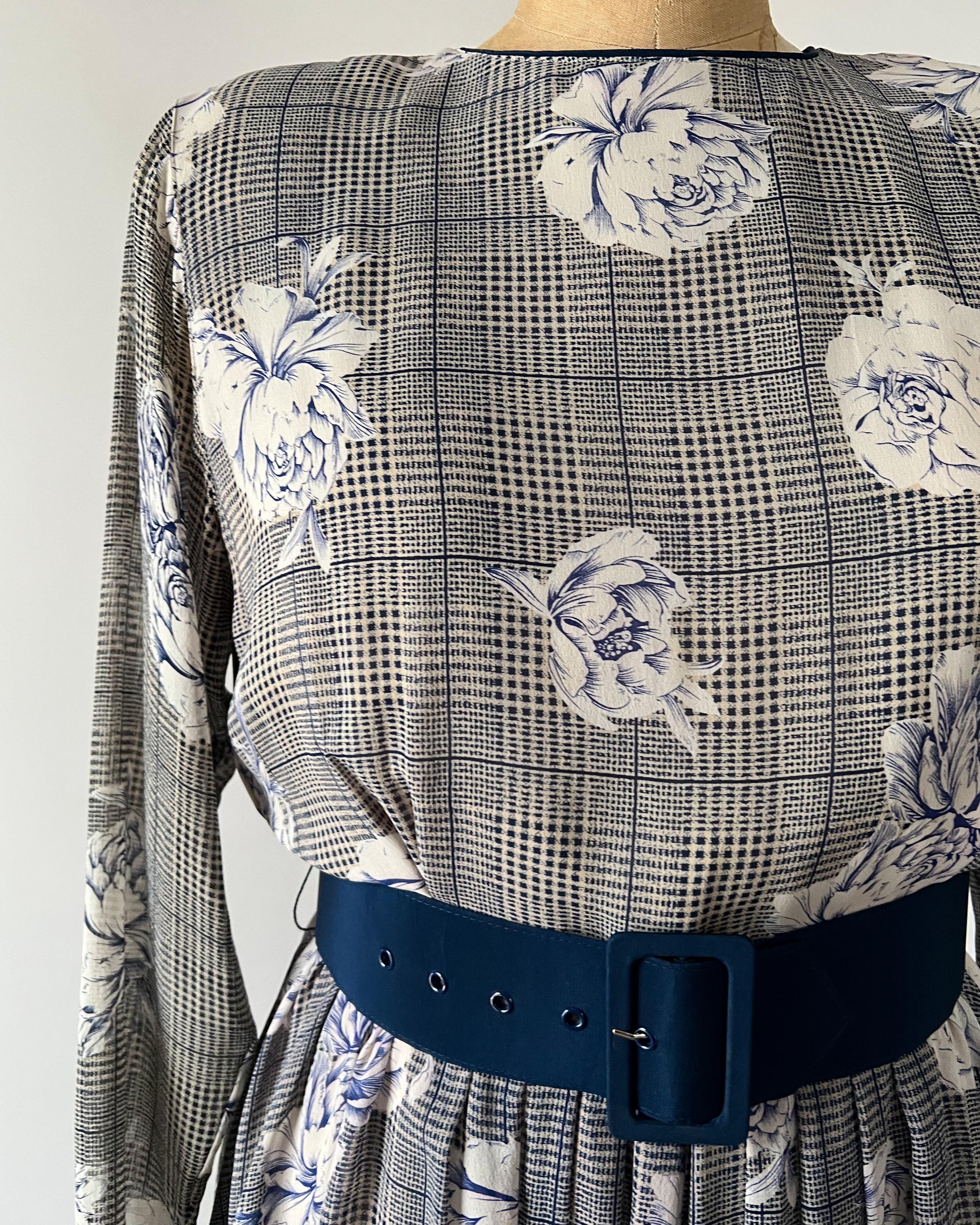 Gorgeous 1980s silk chiffon midi dress with a navy rose and houndstooth print. The dress has crew neckline, long dolman sleeves, nipped waist that cinches with a matching belt, and full, pleated skirt. Back button and zipper closure. Fully lined aside from the sleeves.