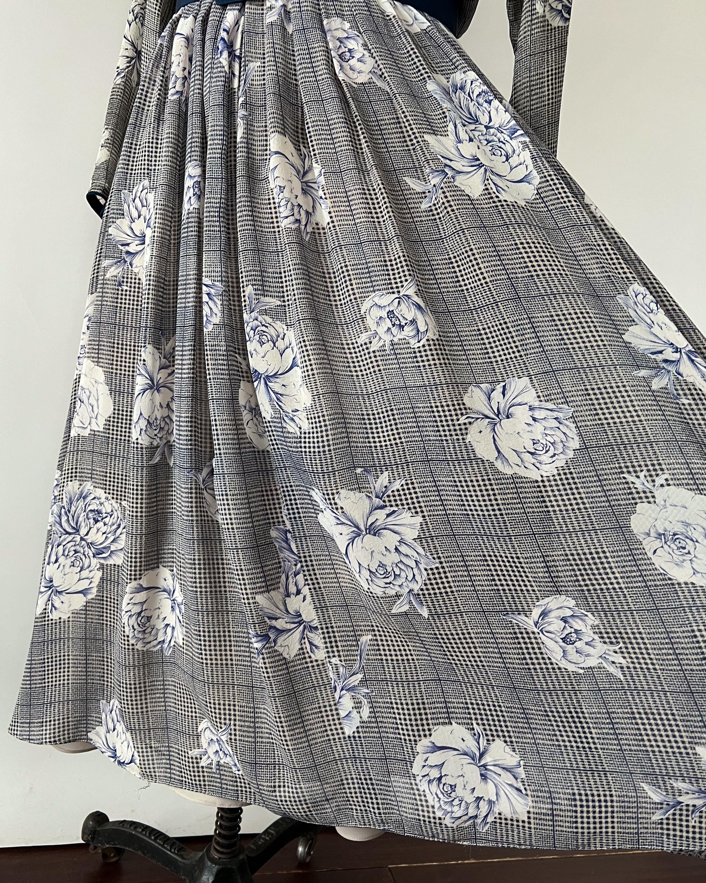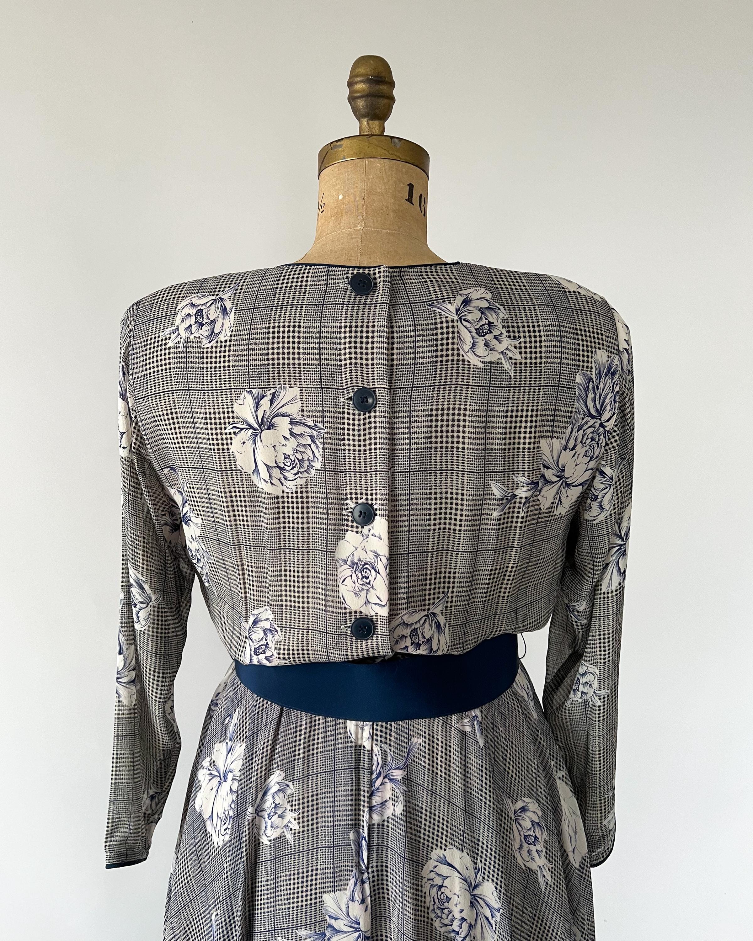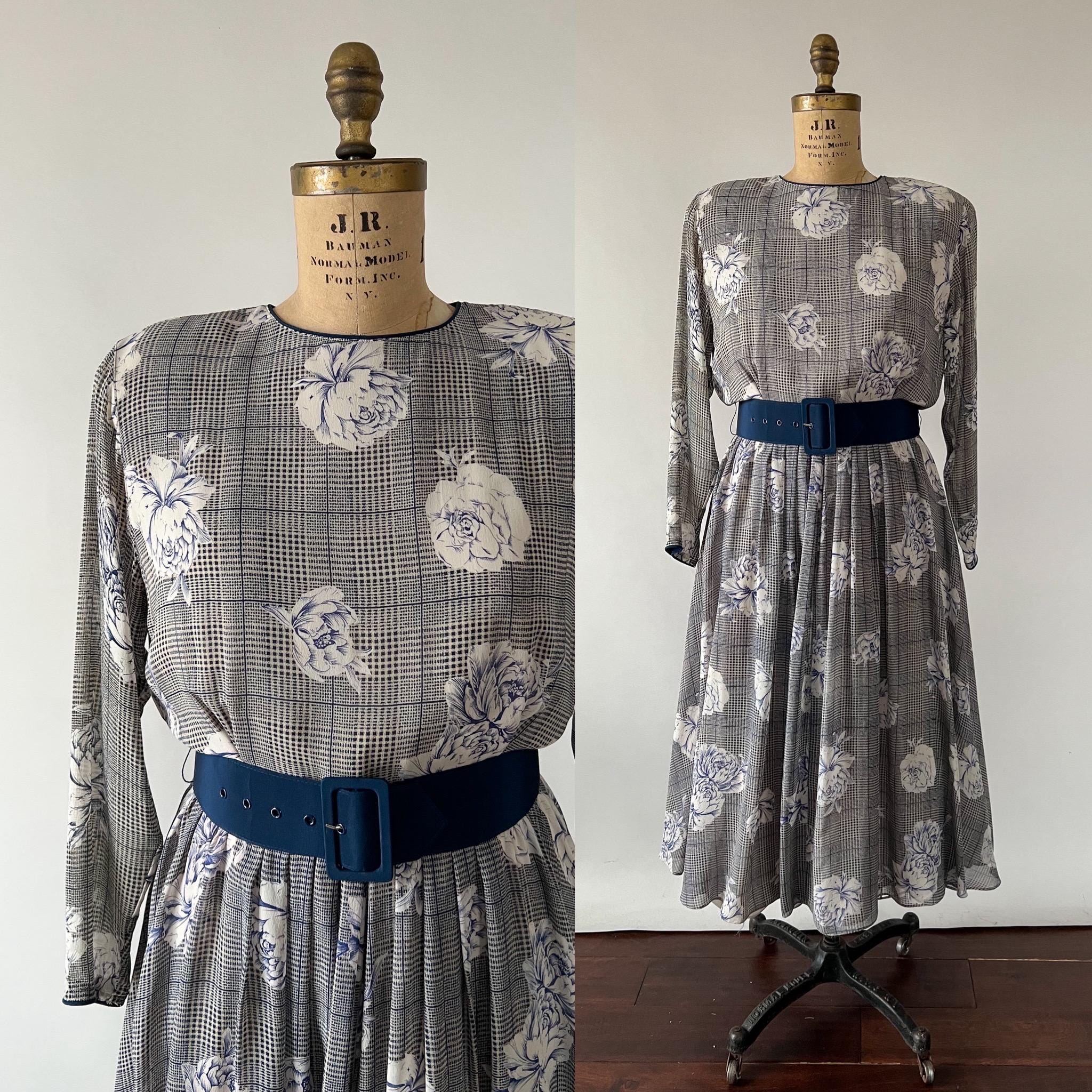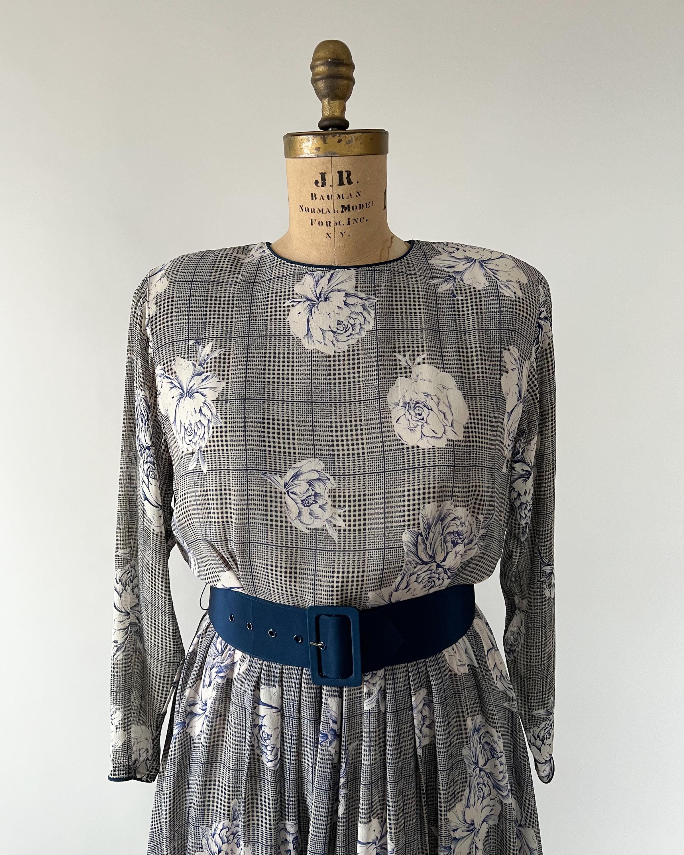 Gorgeous 1980s silk chiffon midi dress with a navy rose and houndstooth print. The dress has crew neckline, long dolman sleeves, nipped waist that cinches with a matching belt, and full, pleated skirt. Back button and zipper closure. Fully lined aside from the sleeves.
