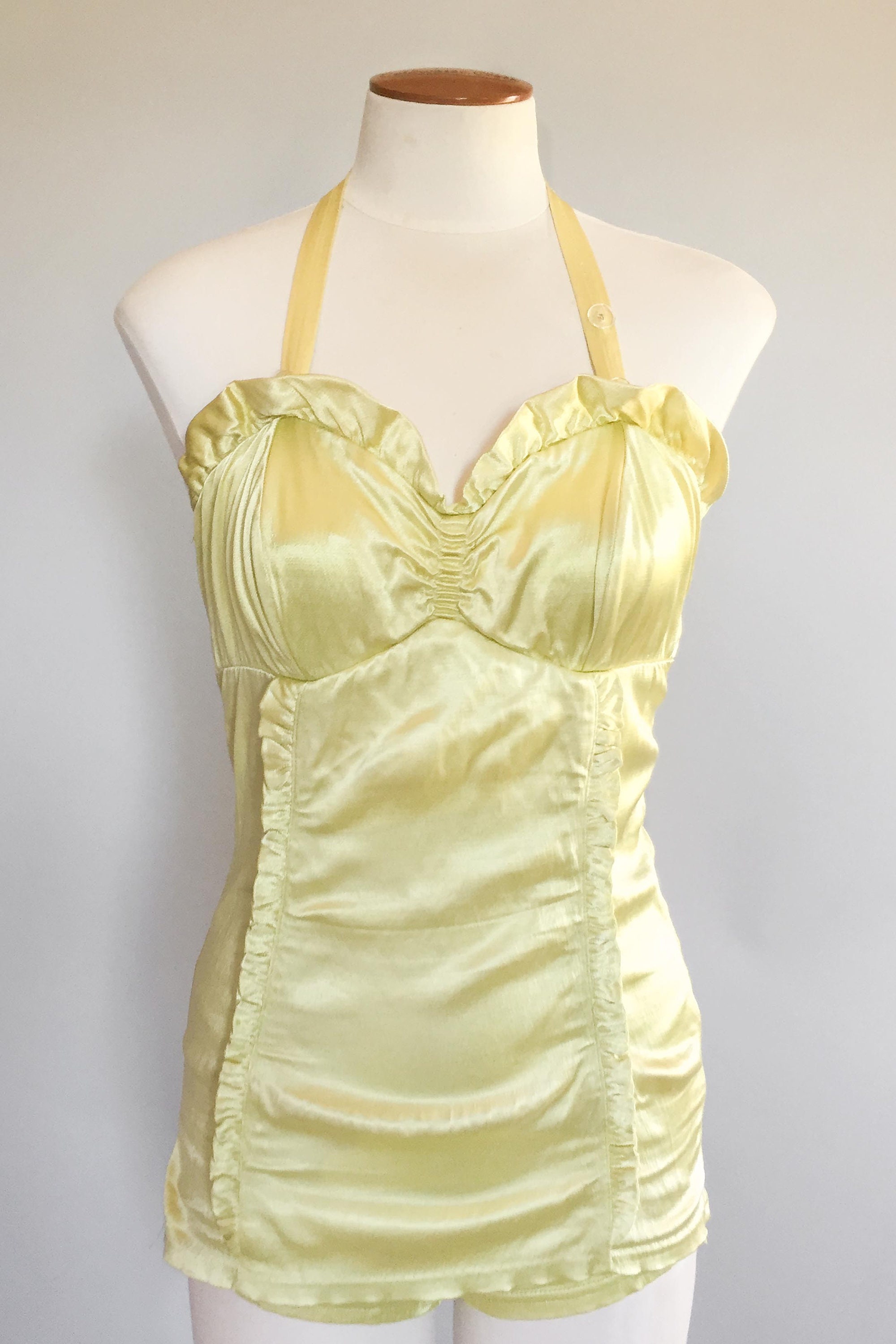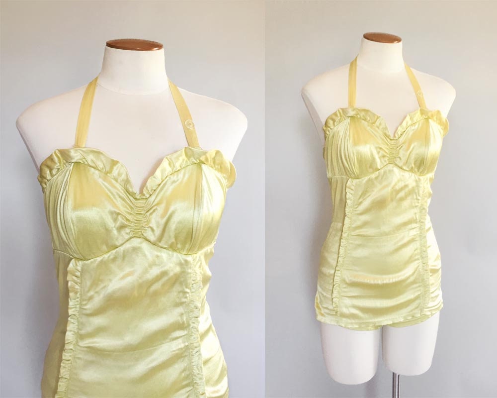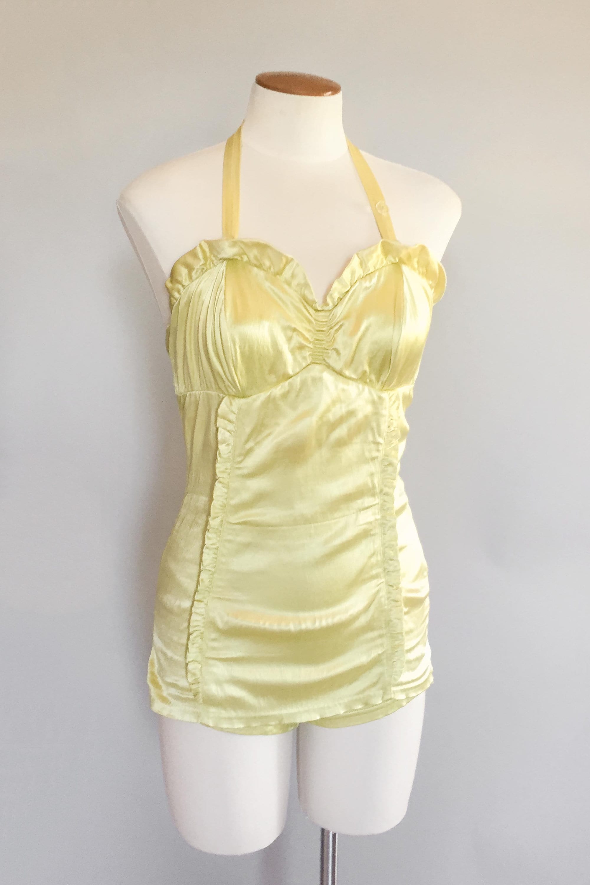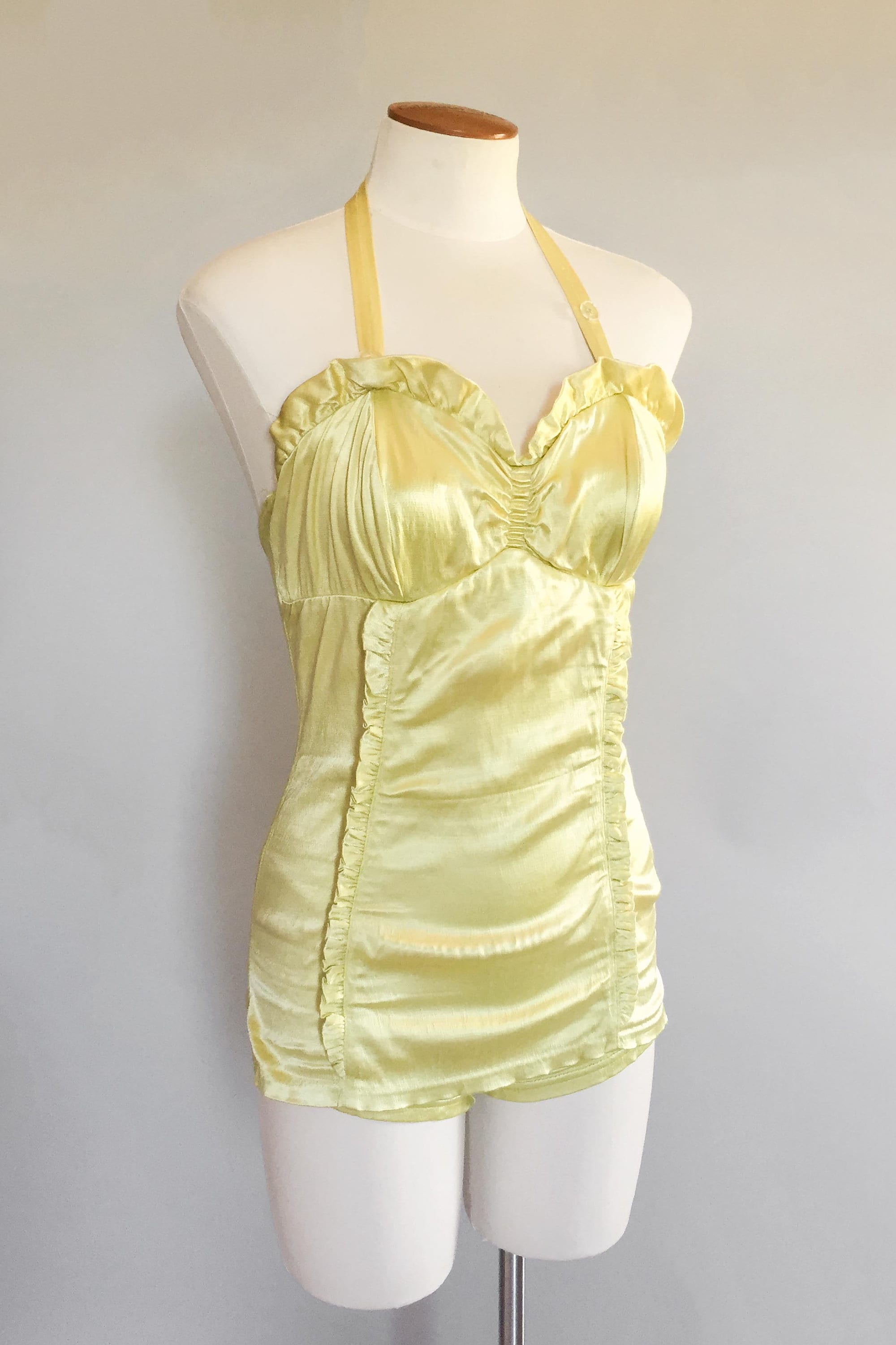 A gorgeous yellow satin swimsuit from the 1940s! It has a ruffled sweetheart neckline with front ruching and a halter neck that can be buttoned at two different lengths. The bathing suit has a skirted front with ruffles down each side seam and shorts underneath. It has a back zipper and button closure. Such a lovely color and flattering fit!