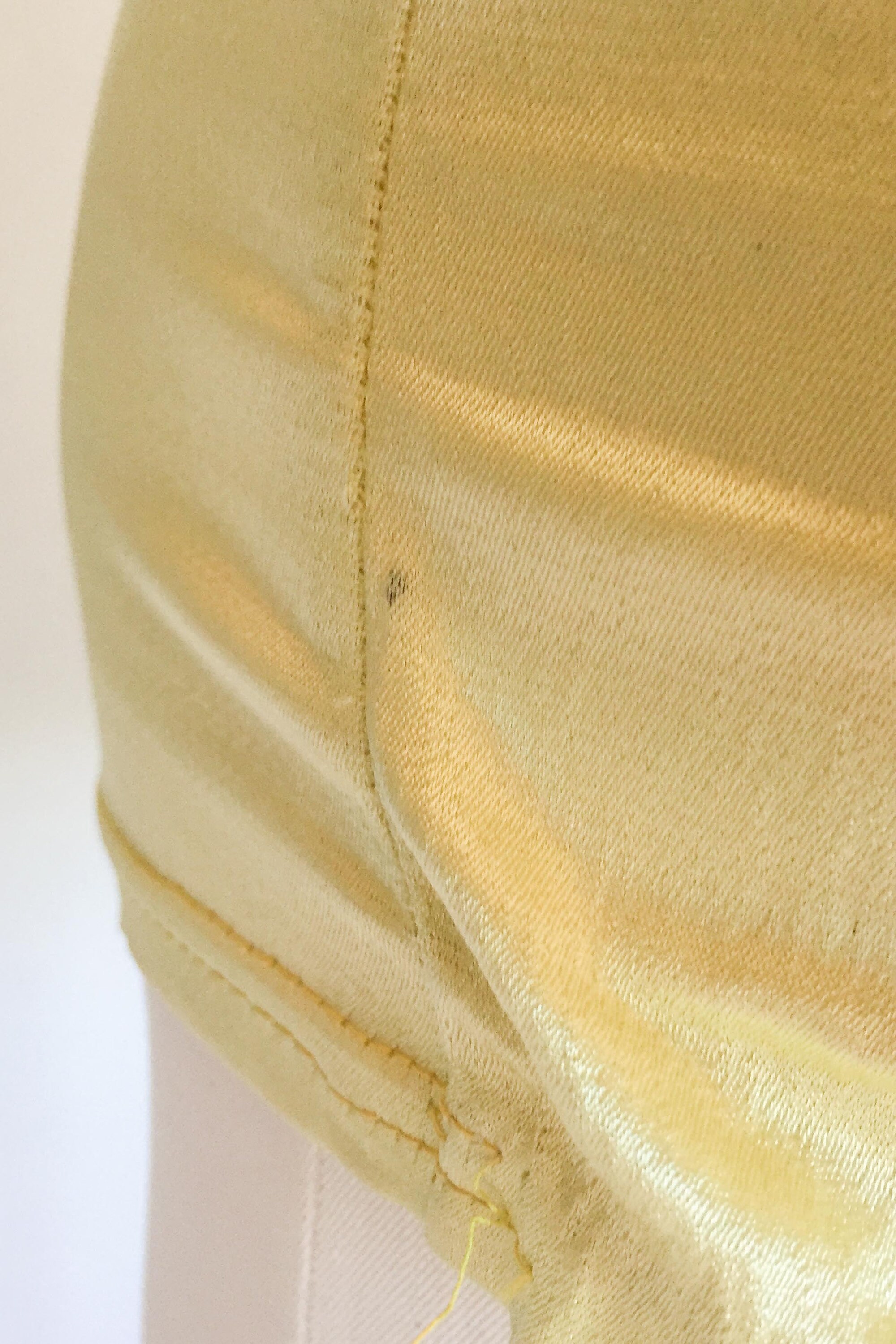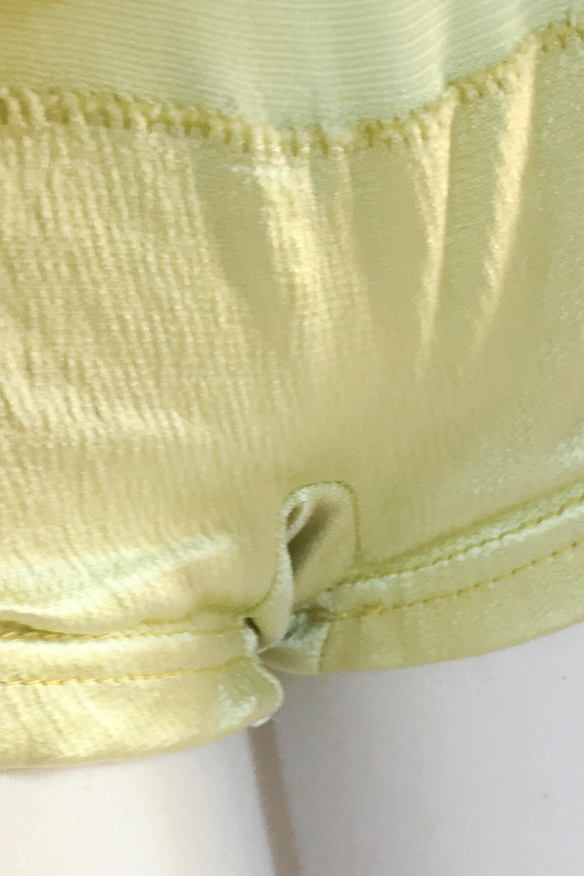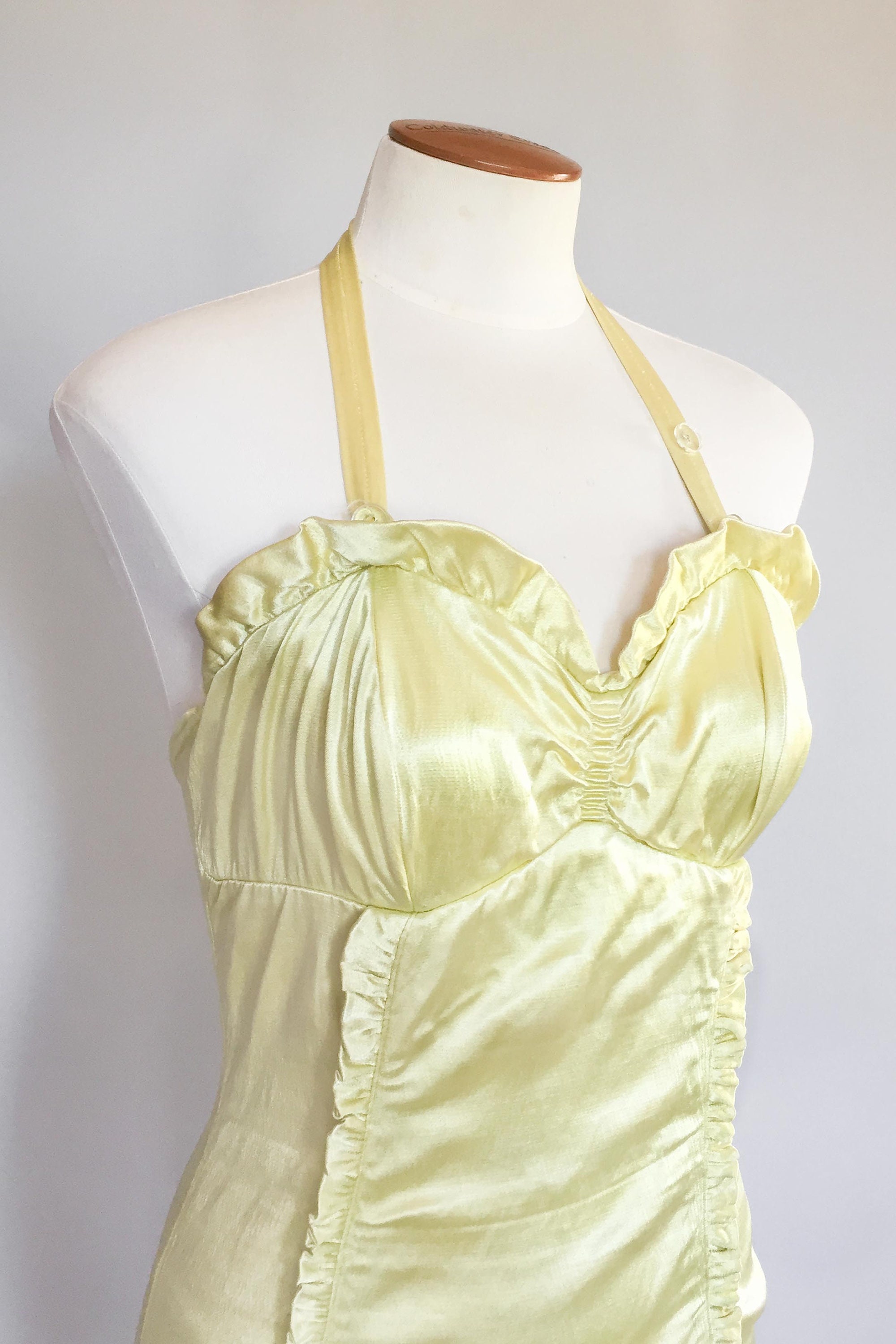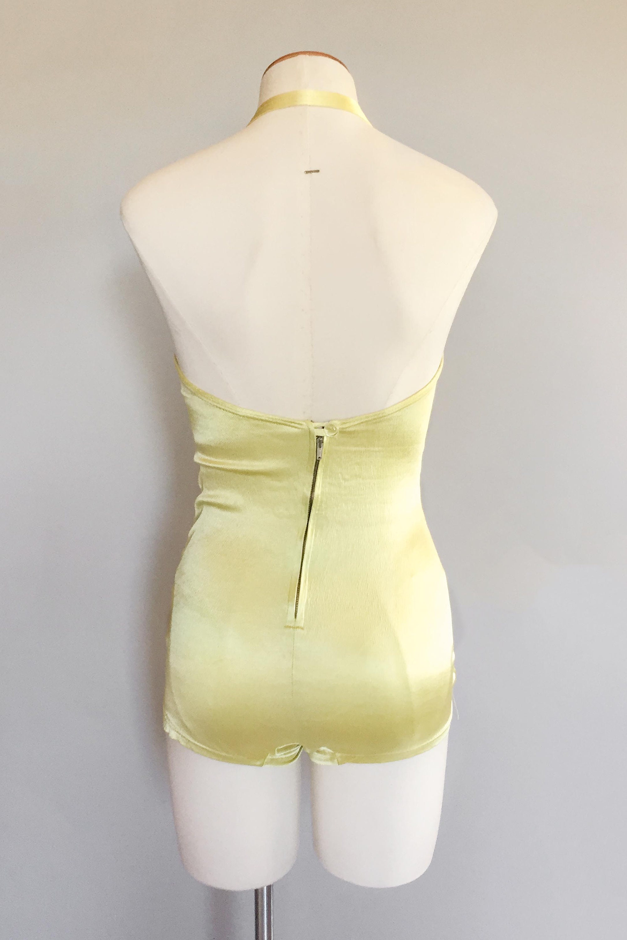 A gorgeous yellow satin swimsuit from the 1940s! It has a ruffled sweetheart neckline with front ruching and a halter neck that can be buttoned at two different lengths. The bathing suit has a skirted front with ruffles down each side seam and shorts underneath. It has a back zipper and button closure. Such a lovely color and flattering fit!