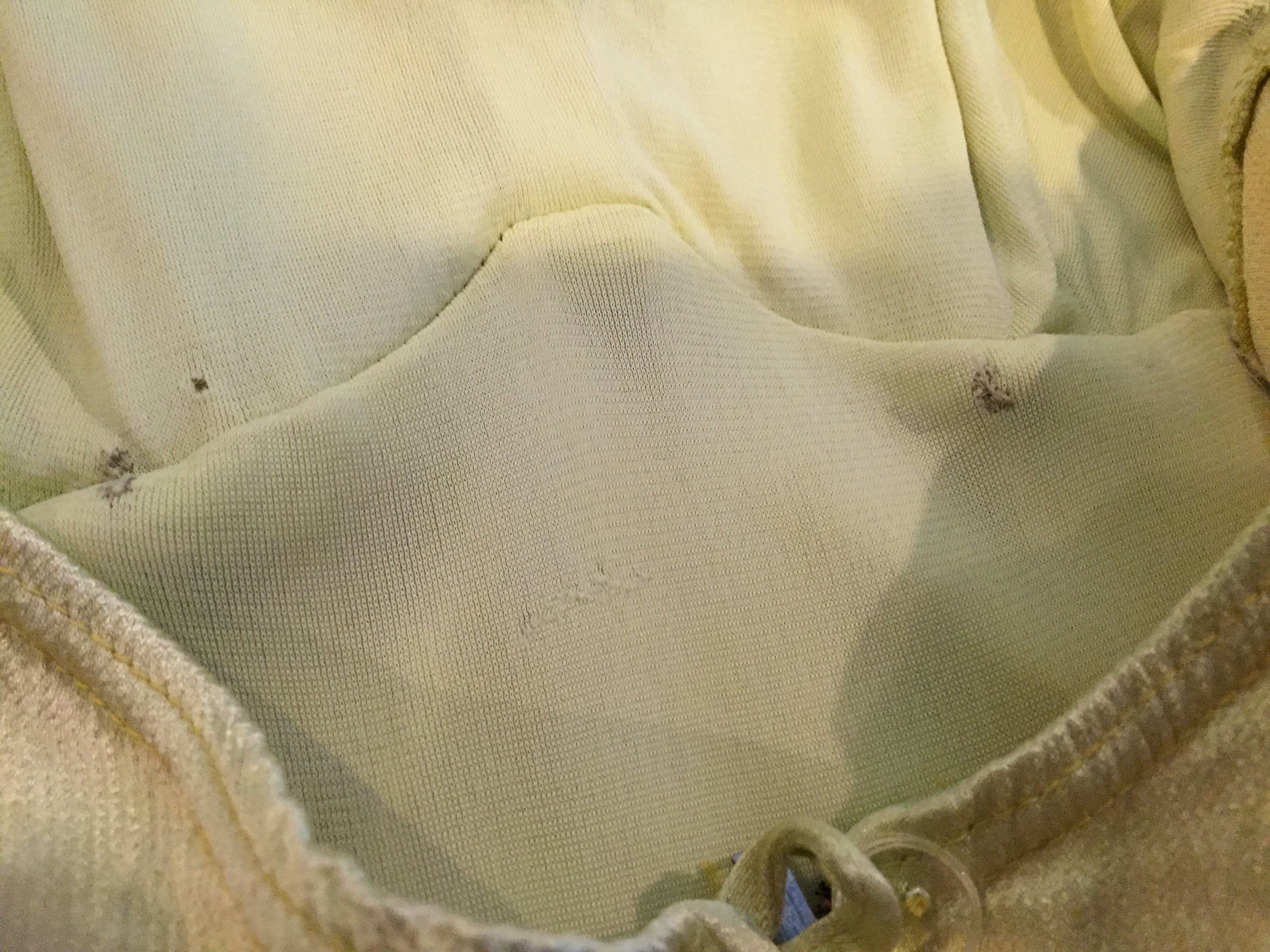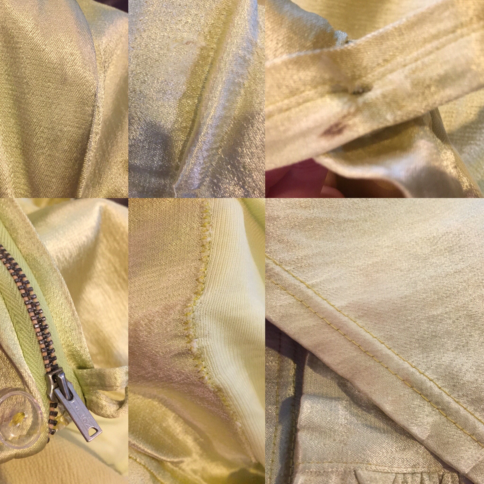 Condition: A few faint spots (including one on the bust and one near the hem) & a couple of smaller, darker ones, (including one near the side seam and one under the strap), some seam stress where the front lining meets the crotch as well as a worn spot on the crotch (but only through one layer), and a small area at the hem of one the leg holes that has a faint reddish tint. There are also a few mends/tiny holes on the inner bust lining. I also noted that the zipper teeth are a little rusty (but not the pull). These flaws are minor and would be hard to detect when worn. More photos available upon request! Sold as-is. All sales final.