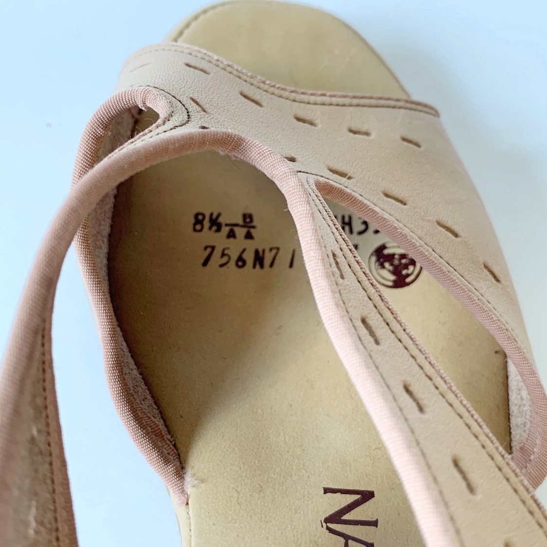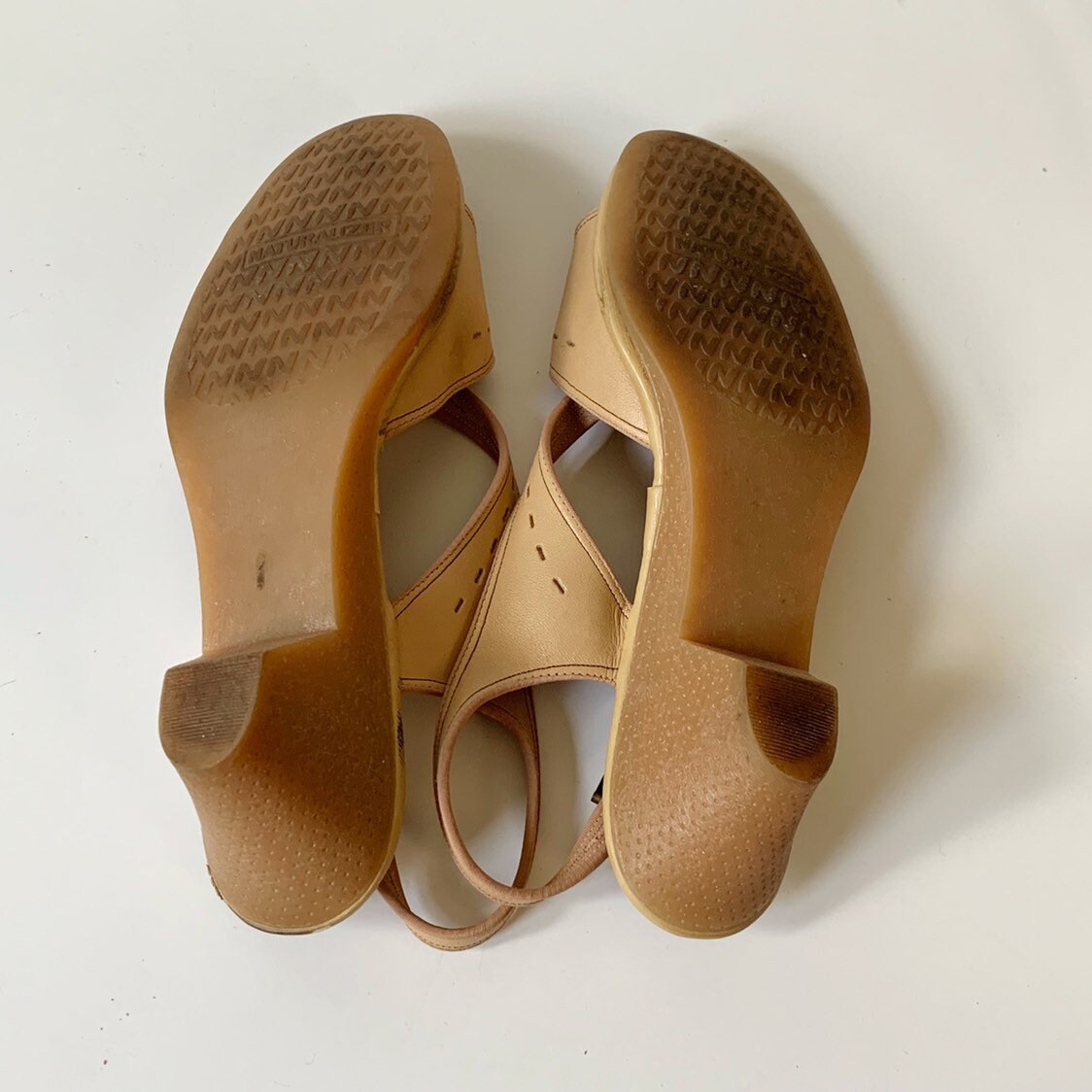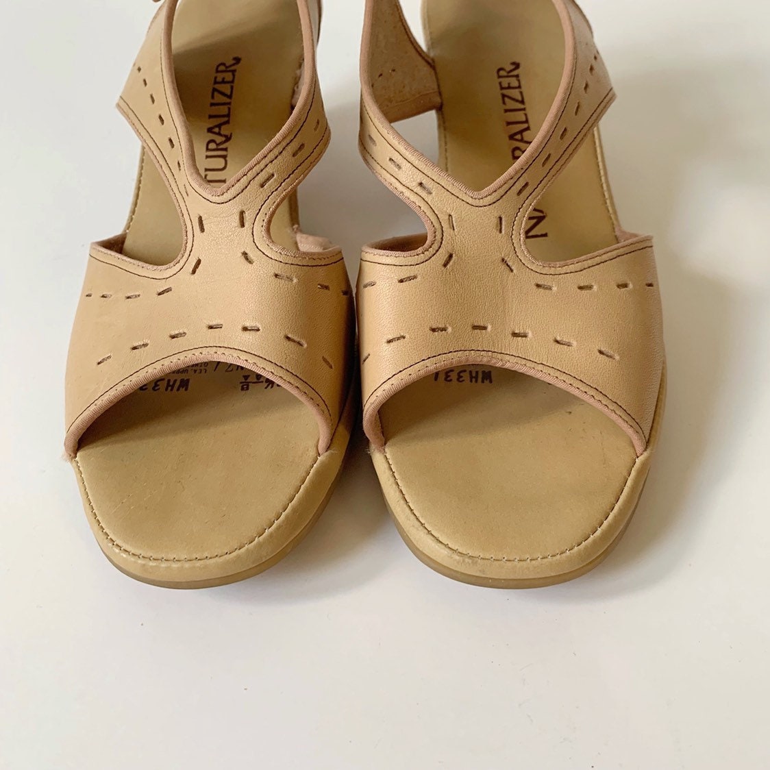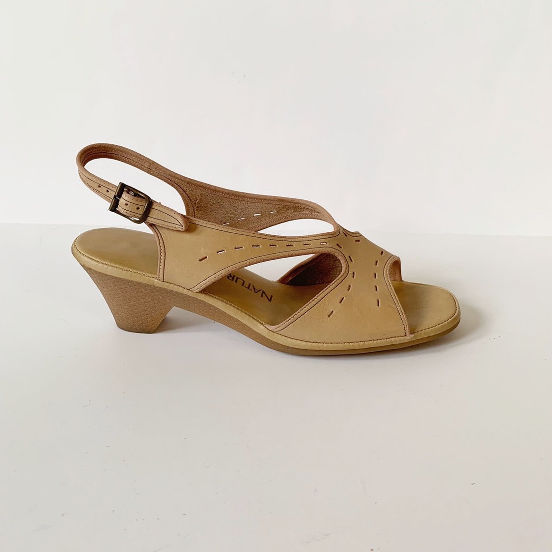1980s natural leather slingback heeled sandals with side cutouts and peep toes.