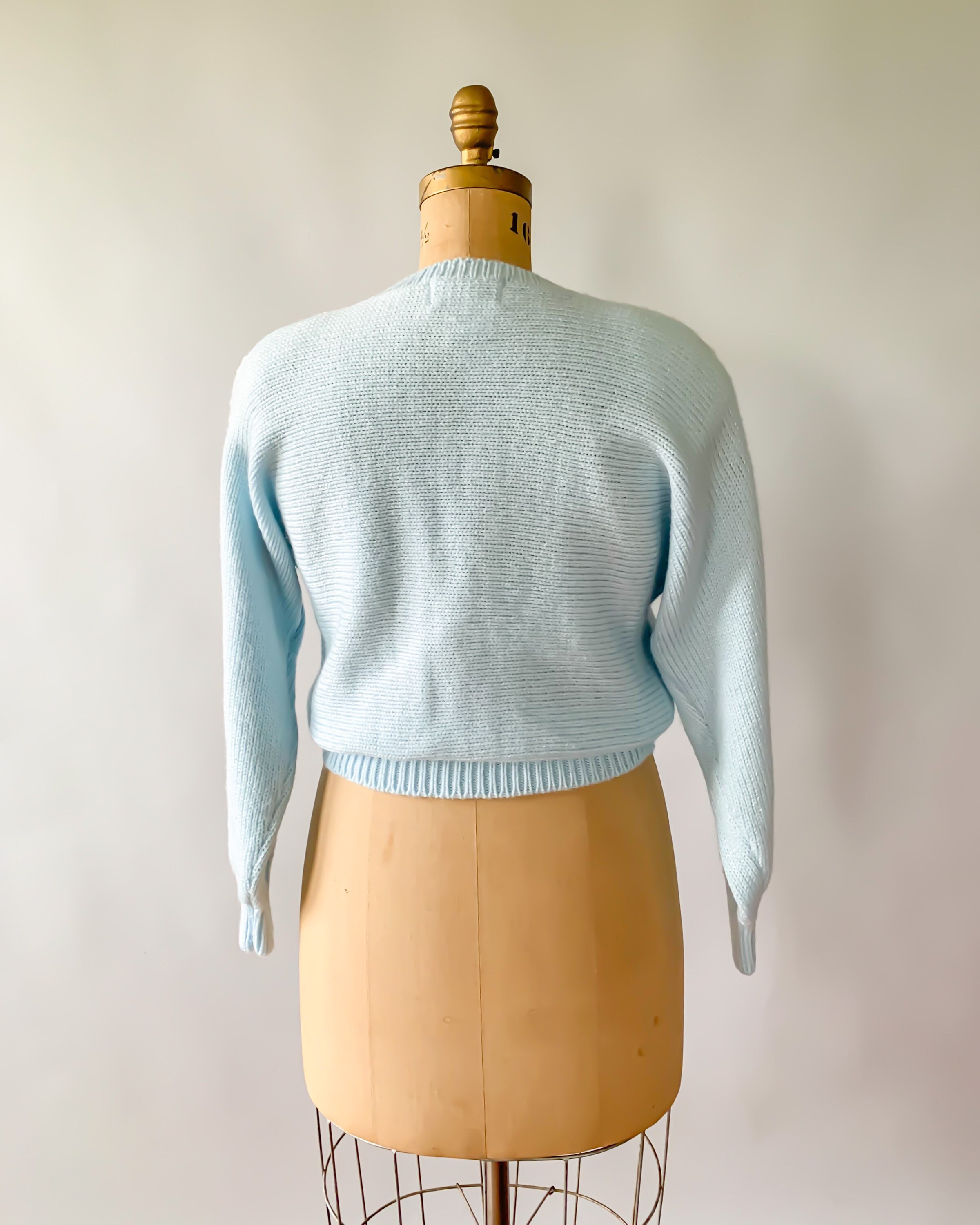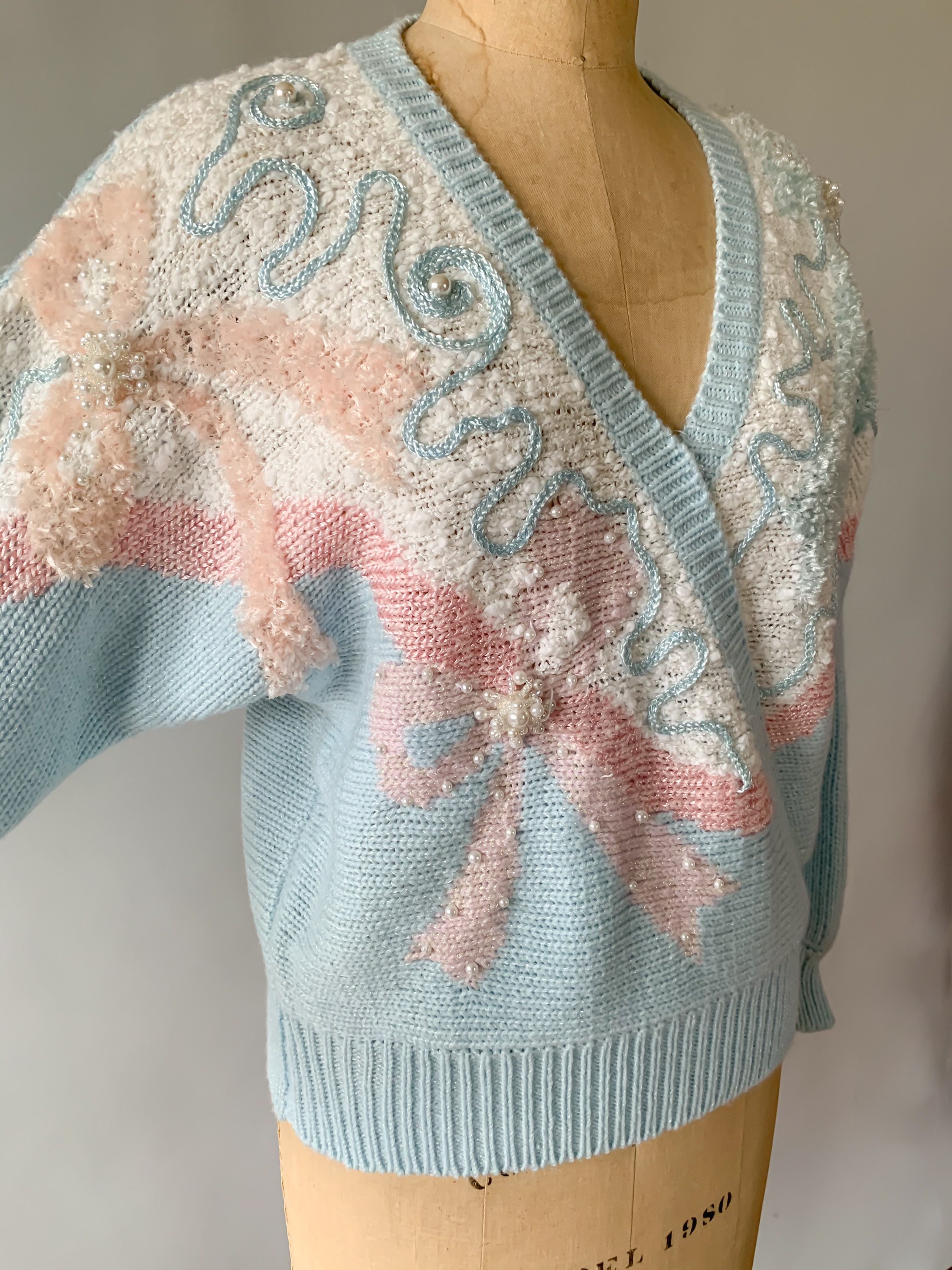 A cozy 1980s wrap sweater with special details! It has a flattering surplus neckline, padded shoulders with long, puffy sleeves, and cropped length. The blue, pink & white sweater features contrasting smooth & fuzzy knit textures, a pattern of bows. It is embellished with pearl beading and squiggling, ribbon soutache. Such a unique and lovely statement piece that is also super cozy! Perfect to wear with leggings when your lounging around the house but also want to be ready for a zoom chat!