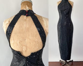 Vintage 70s Dress, 1970s Disco Peach Polyester Maxi Gown, Spaghetti Strap Sexy Cutout Open Back Full Length Skirt, Grecian Style, XS S